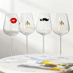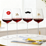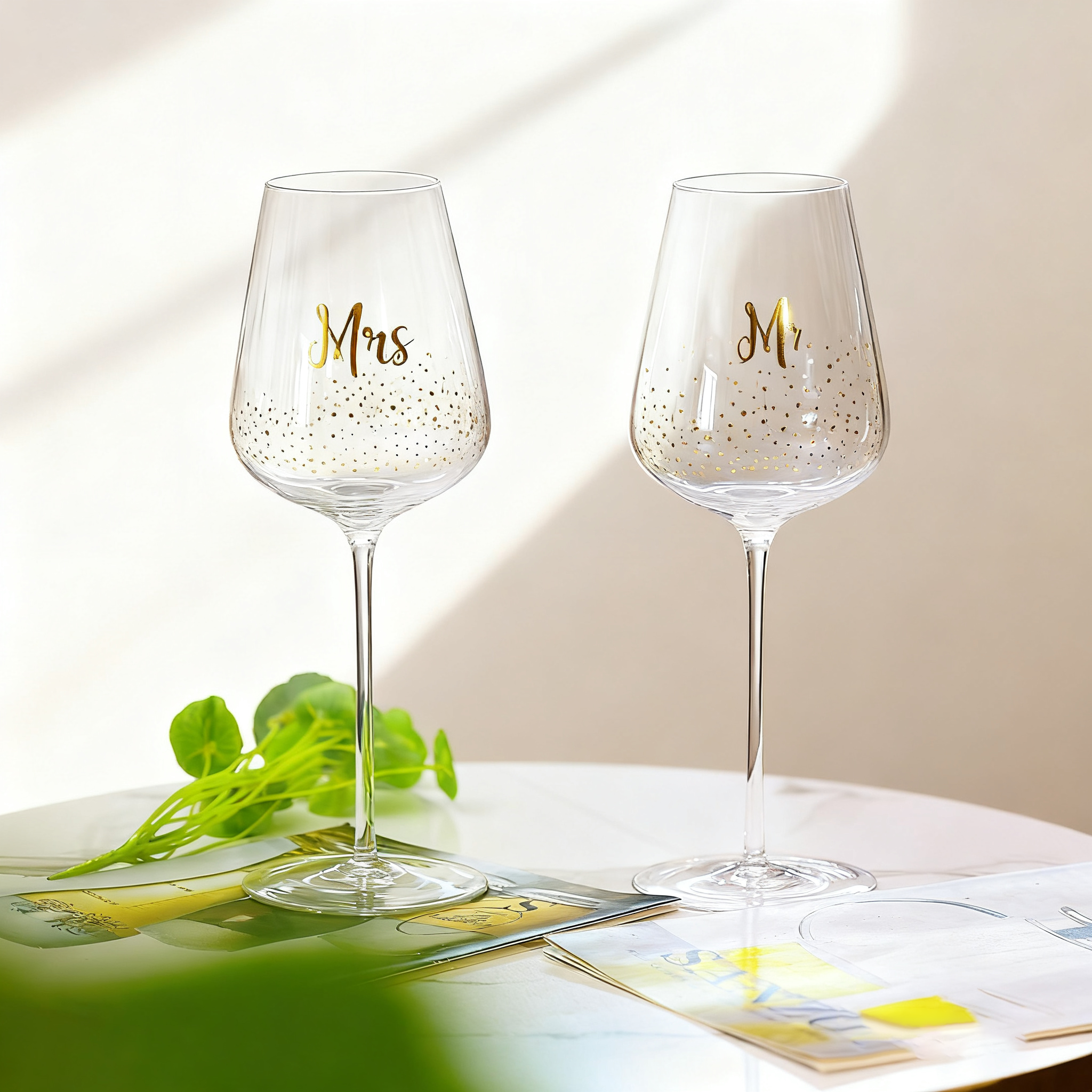 Crafted from clear, high-quality glass with a sleek stemmed design, these glasses are perfect for date nights, weddings, or gifting to couples. Durable yet stylish, they blend whimsy with sophistication—ideal for sipping wine in style!